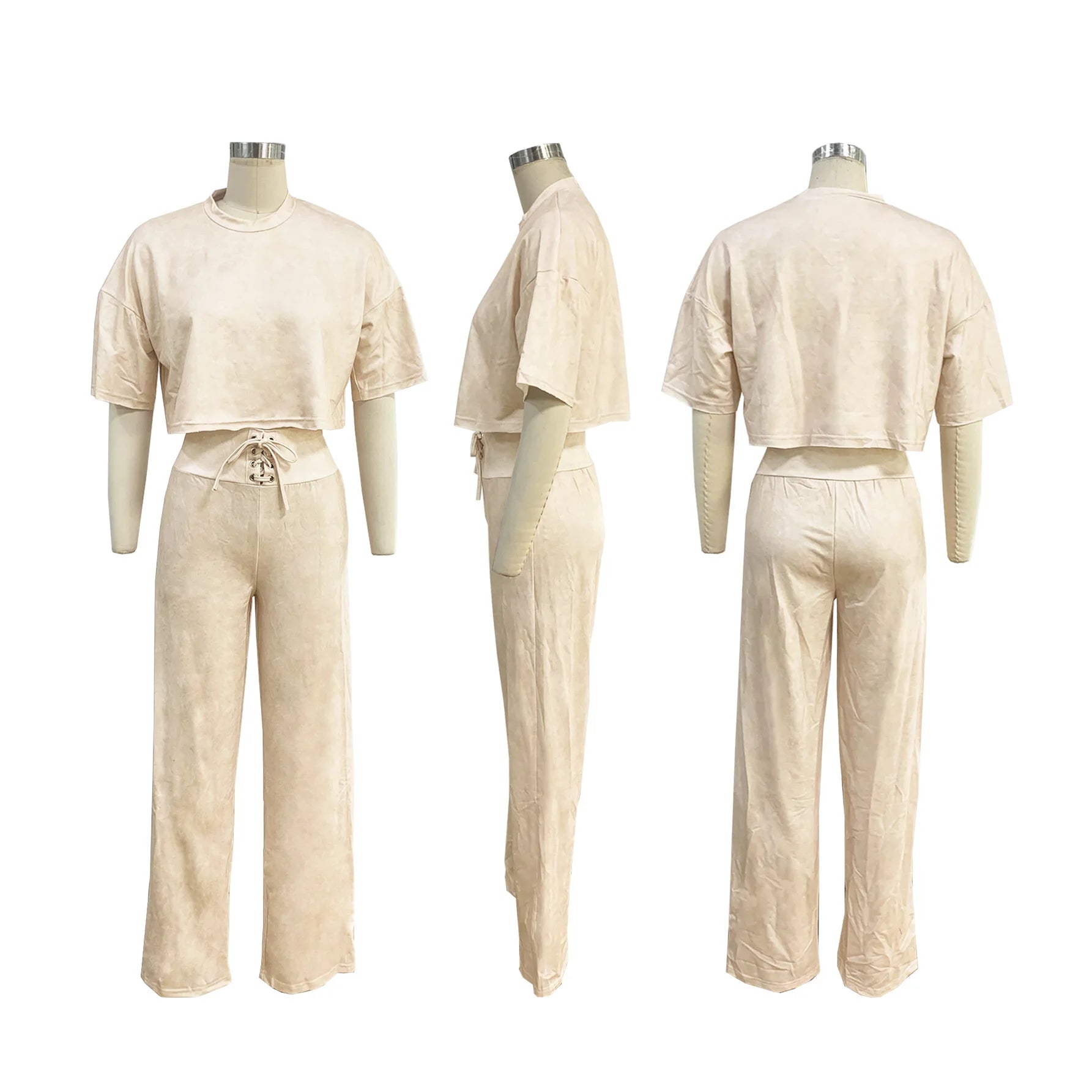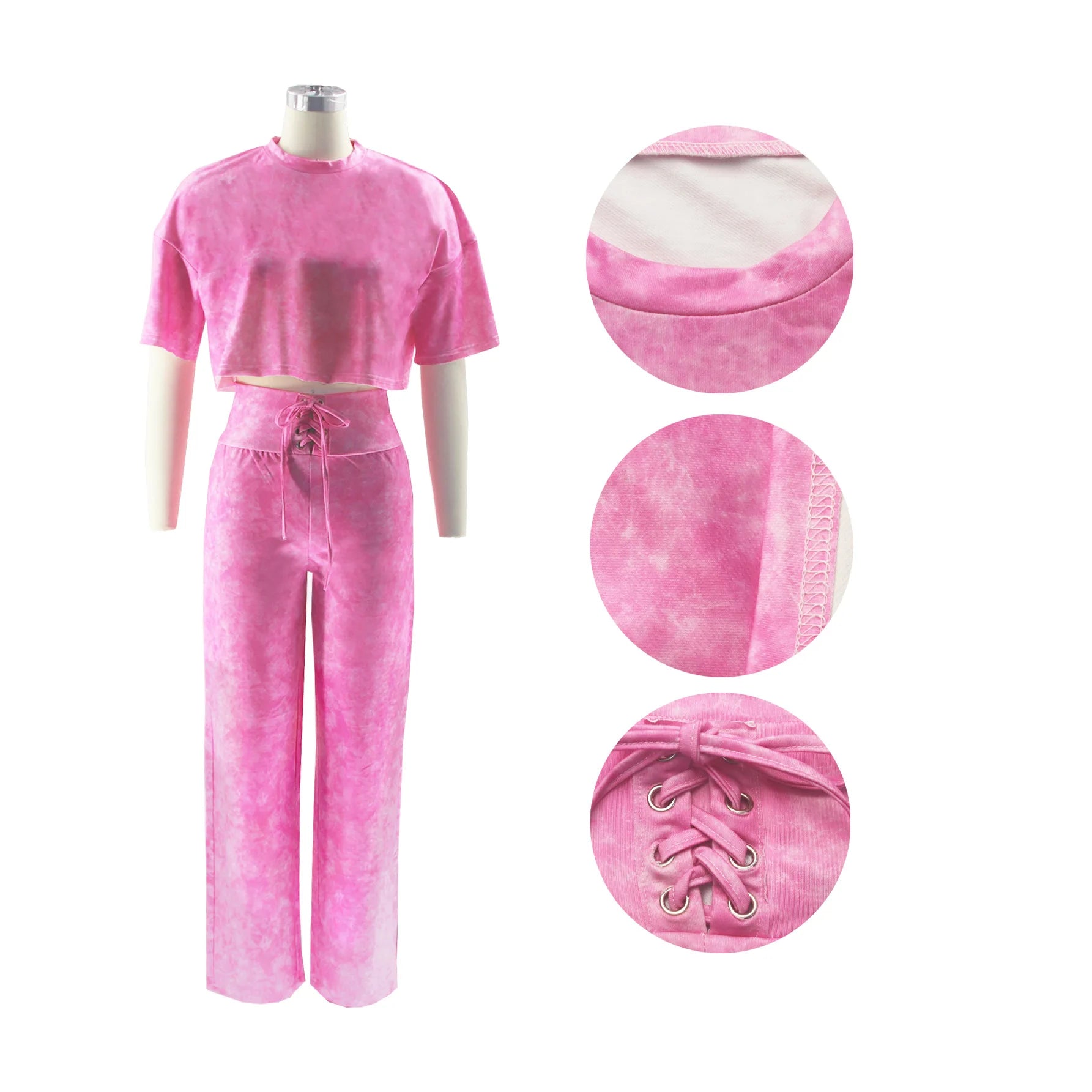 - Two-Piece Set—short-sleeve top paired with lace-up high-waist joggers for a cohesive, sporty-chic silhouette.