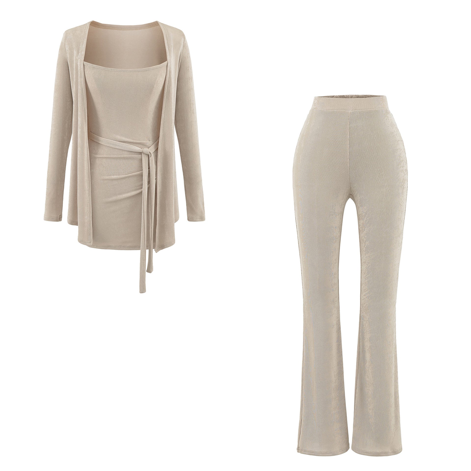- Three-Piece Harmony — camisole top, button-up cardigan, and full-length pants in one refined set.