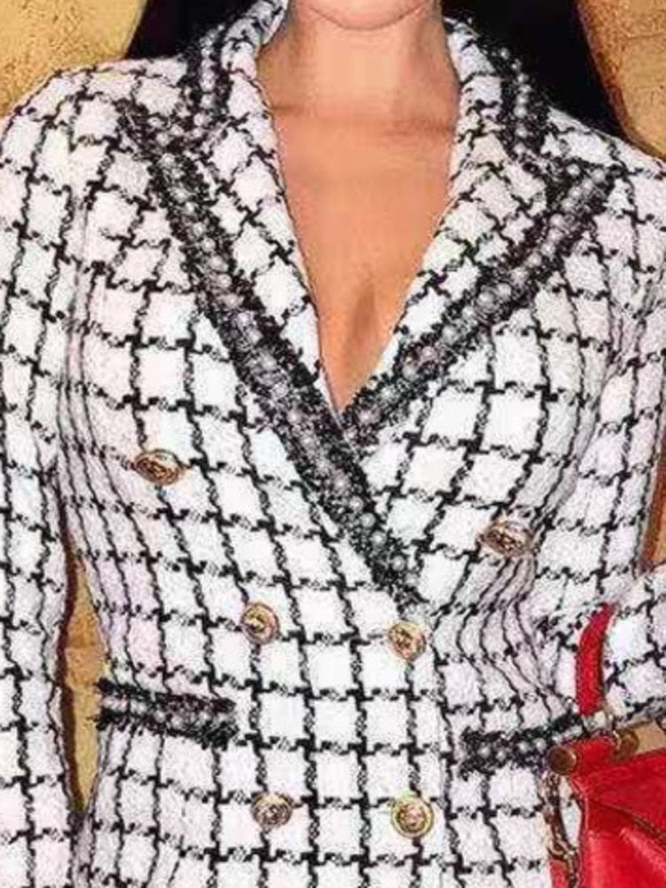 Fit Type: Slim, tailored cut. Length: Mid-length classic coat. Sleeve: Full. Color: Black & White Check with contrast beads. Season: Autumn / Winter.