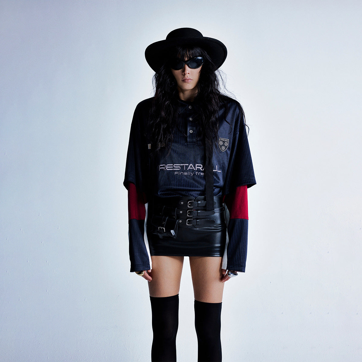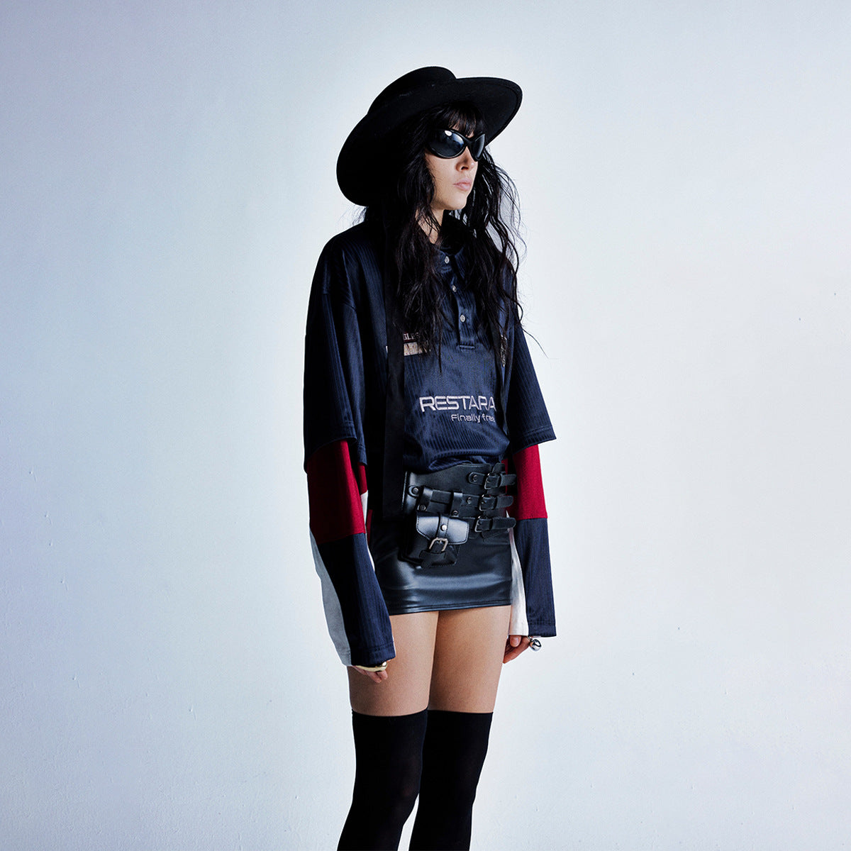 - Color-blocked navy with a premium lapel polo silhouette.
