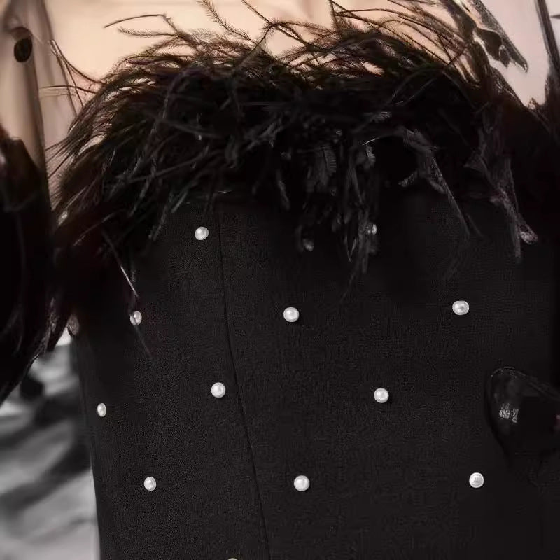 - Pearl waist detail adds a luxe focal point against the solid black.