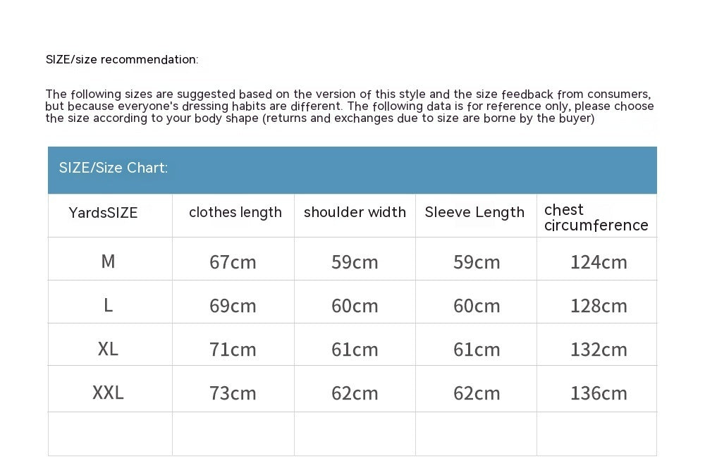 Loose, relaxed cut designed for casual layering. Available in M, L, XL, XXL. Asian sizing runs 1–2 sizes smaller than EU/US—please size up for best fit. Please consult the size chart and allow 2–3 cm differences due to manual measurement.