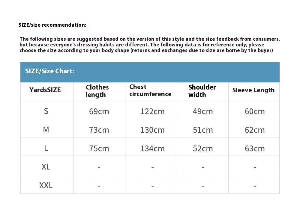 Fit: Regular cut with long sleeves. Sizes: S, M, L. Asian sizes run 1–2 sizes smaller than European and American standards; choose the larger size if between two. Please allow 2–3 cm differences due to manual measurement. Colors may vary slightly from images.