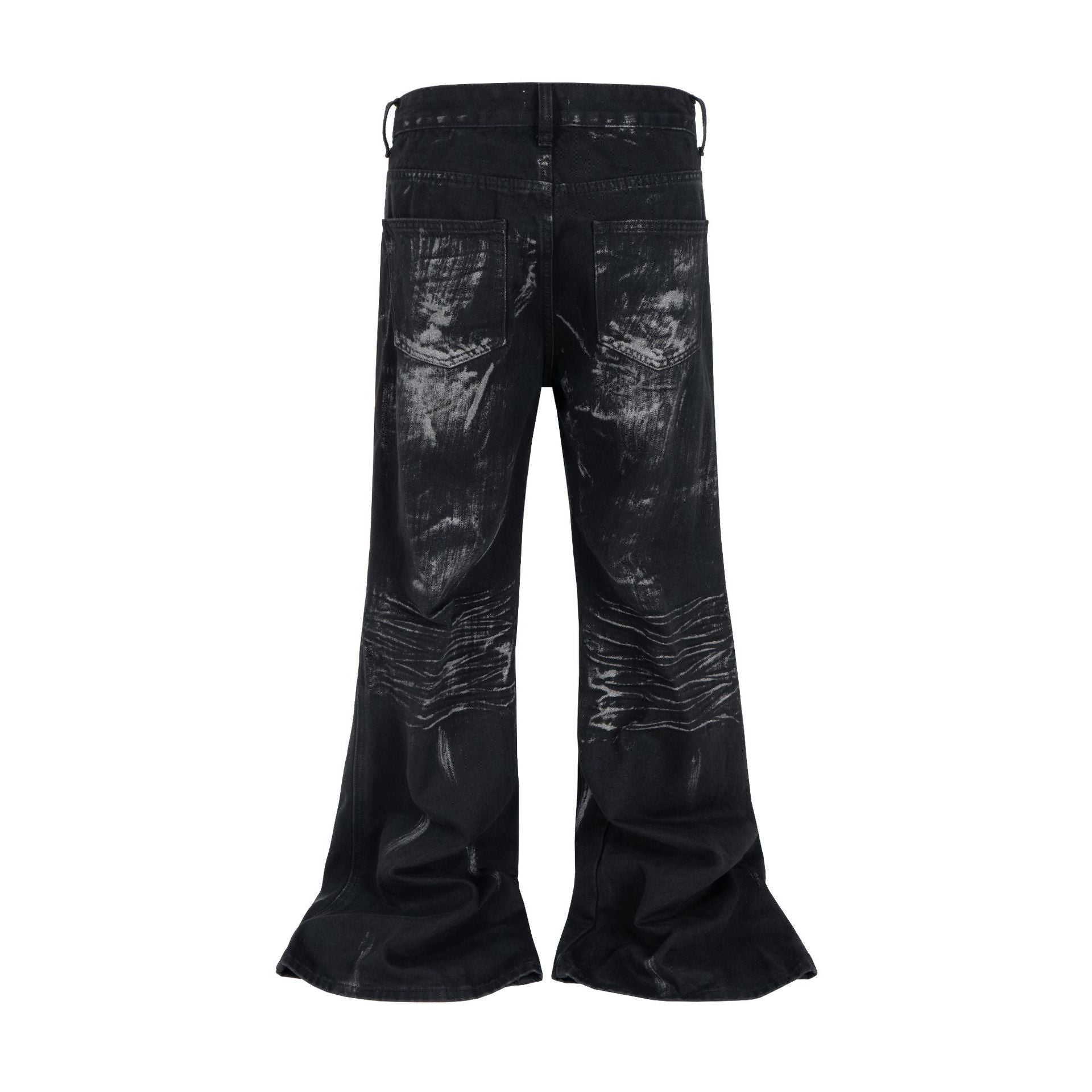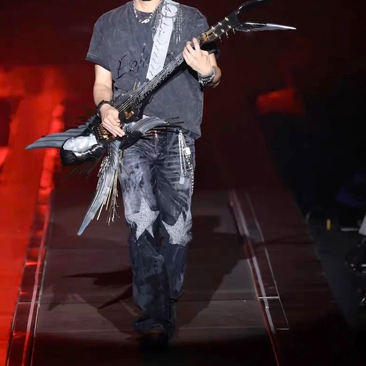 - Washed black denim with rhinestone accents catching light.