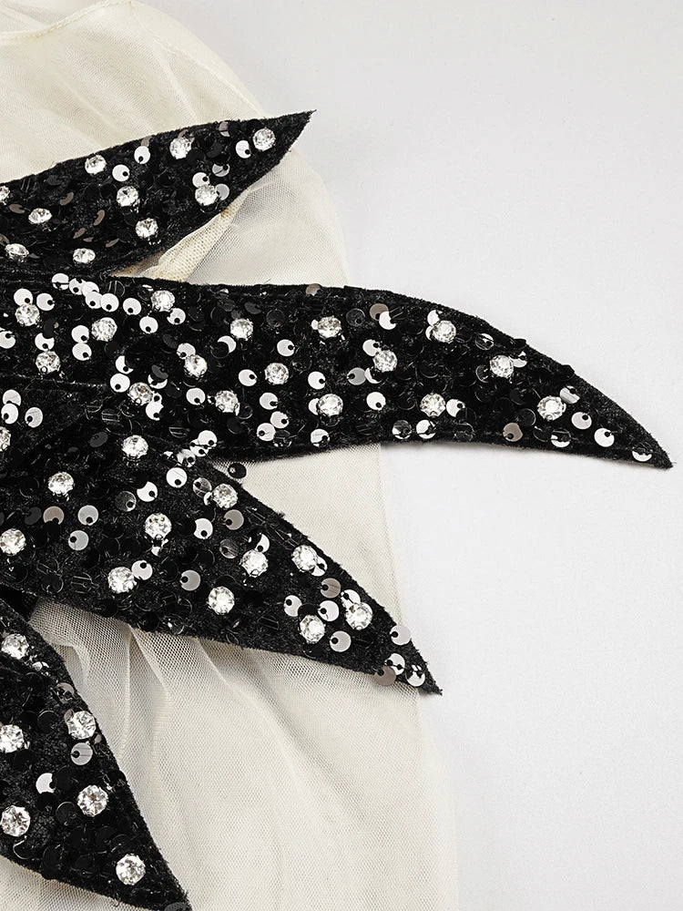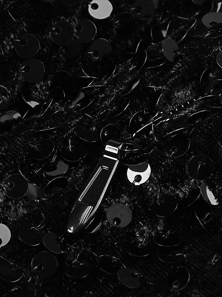 Main fabrics: copper ammonia fiber and polyester. Velvet patches provide plush softness while sequins catch the light with every movement. The mesh inserts add breathability and a contemporary, runway-ready contrast, finished with a subtle stretch for all-night comfort.